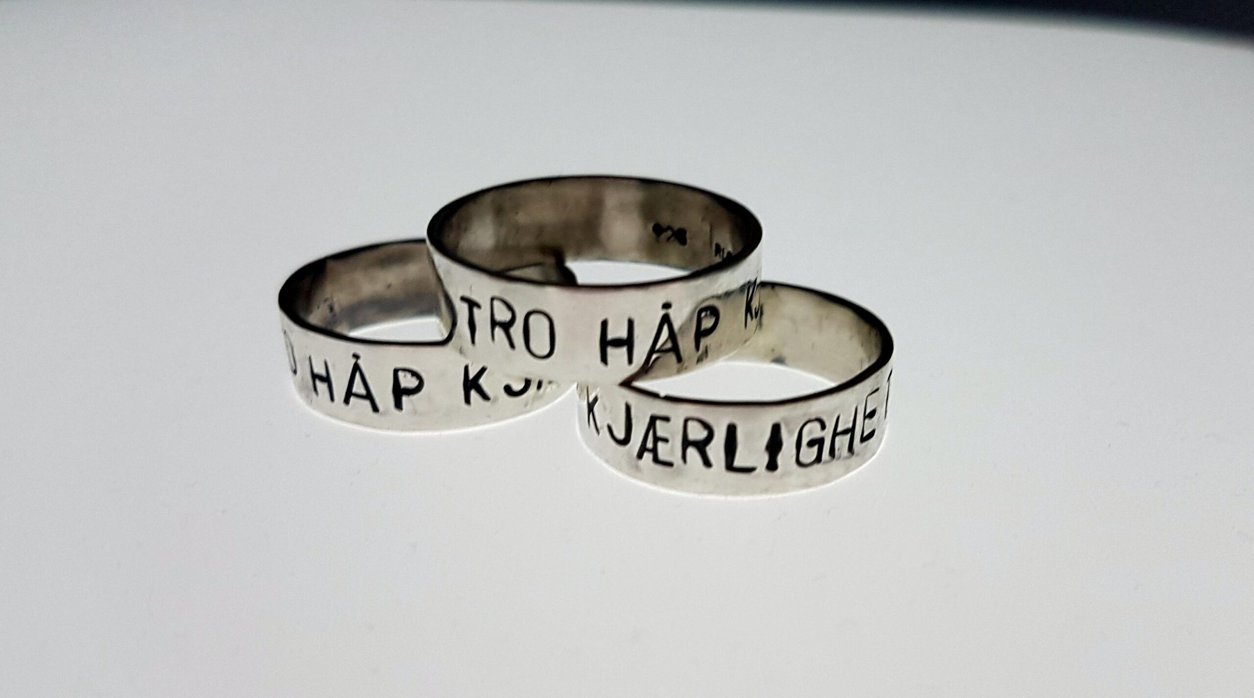 «Tro Håp og Kjærlighet», er en moderne vri på en gammel klassiker. Et spennende smykke til konfirmanten eller deg selv, som også passer som tommelring.